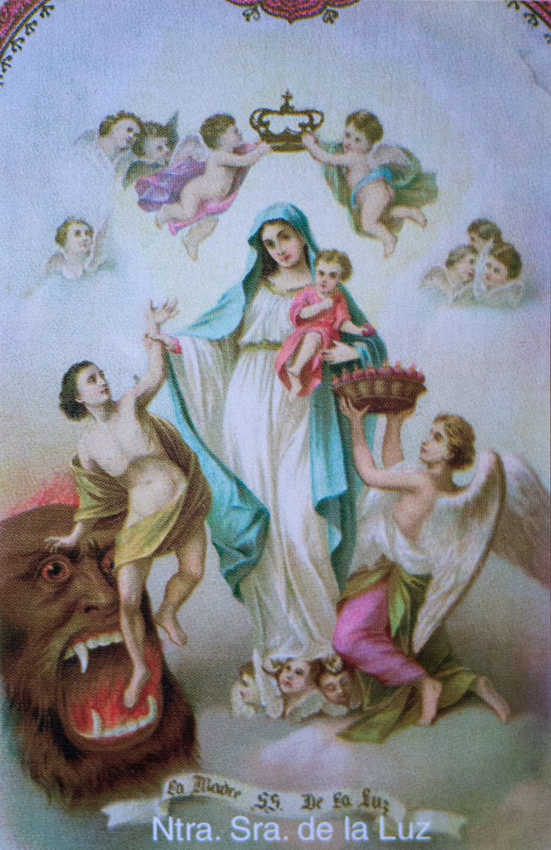 We had never seen a representation of the Virgin Mary like this one which included a fantastical monster’s head with a gaping mouth. It wasn’t until the following year, in Mexico City, that we discovered two prayer cards at the religious mall behind The Metropolitan Cathedral of the Assumption of Mary of Mexico City featuring the same monster’s head, with the inscription “La Madre SS De La Luz,” “Most Holy Mother of Light.”