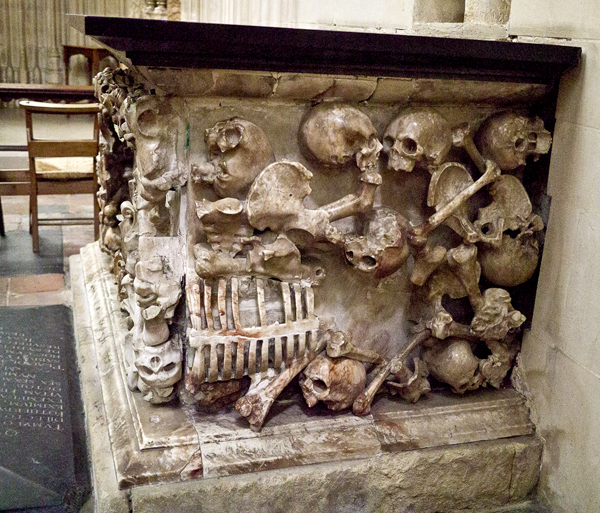 My favorite piece was a skeleton bedecked tomb-like monument (top four images) located in side altar; the fact that a bat was flying around the otherwise solitary space at the time of my visit certainly contributed to the atmosphere. There as also a lovely death's head-embellished flat monument (fifth down) in the main nave and, in the crypt, a deeply arresting charred and gold-leaf embellished Pieta with an interesting back story; created in 1904 for a church in Munich, it was damaged by fire in 1986. Afterwards, as the Canterbury Cathedral website explains, it was:
